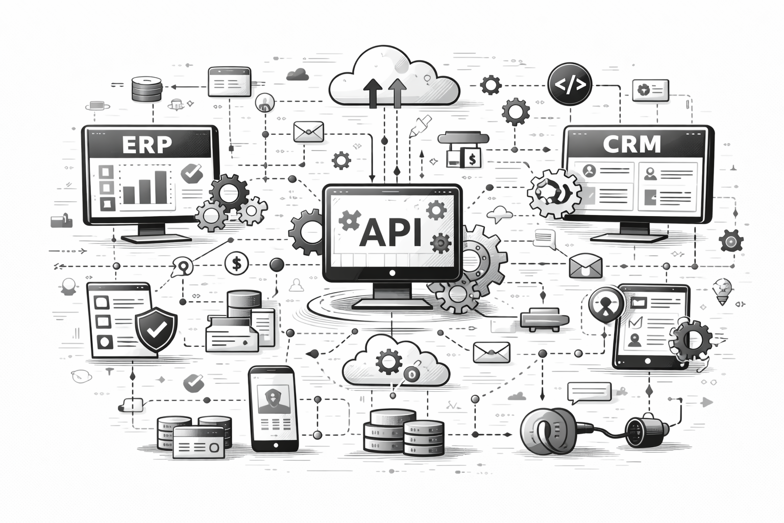 Connexion ERP, CRM, paiement, et systèmes tiers.