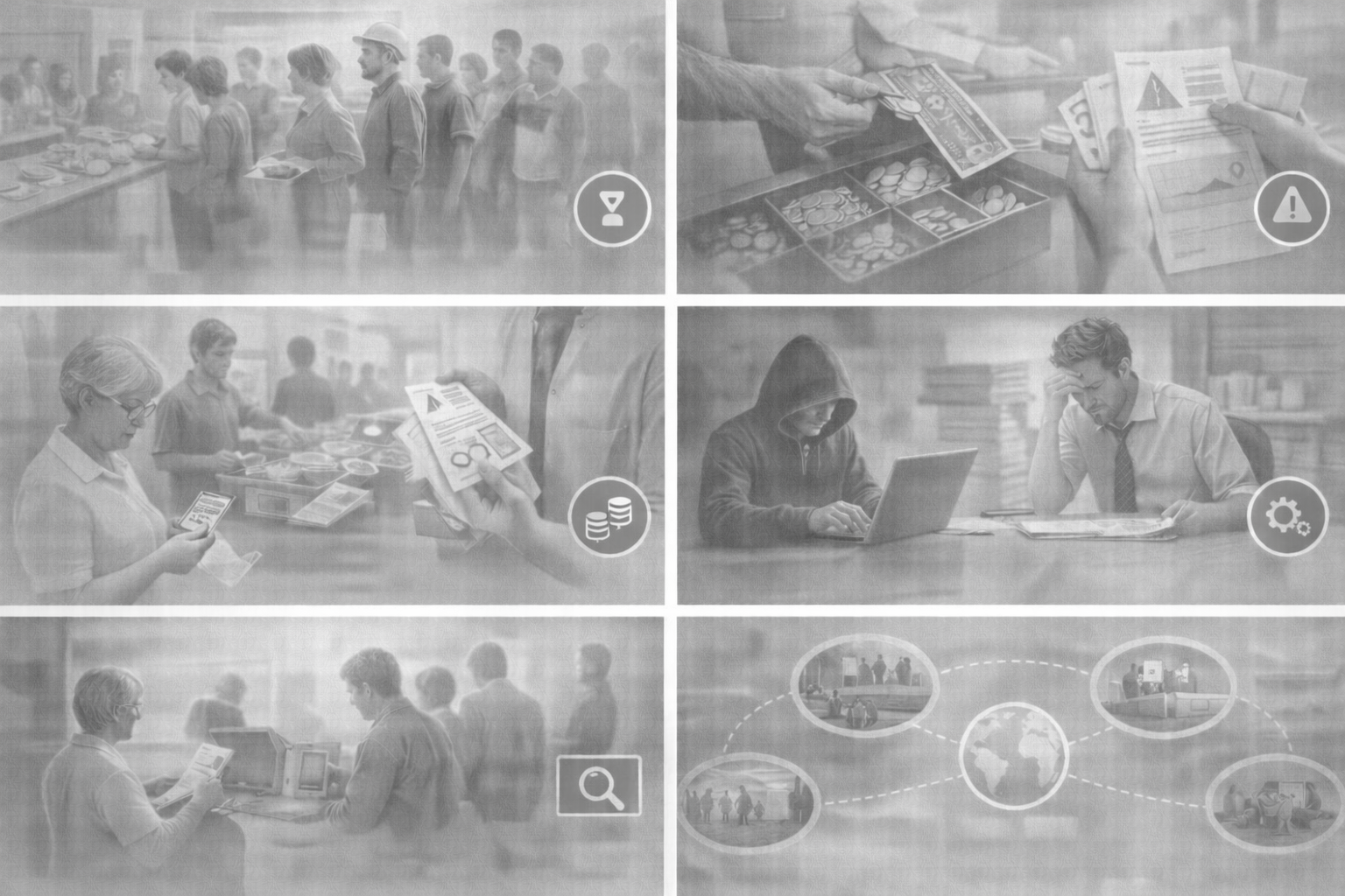 La restauration collective — écoles, usines, hôpitaux, cantines d'entreprise — fait face à une complexité quotidienne : files d'attente aux repas, gestion manuelle des espèces, difficultés à gérer les subventions et comptes individuels. Fraude ou abus d'avantages, manque de visibilité en temps réel et charge administrative lourde s'ajoutent quand on gère plusieurs sites.